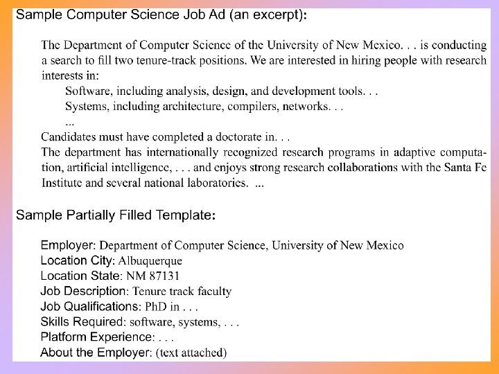 Template Based Information Extraction • One IE approach is to provide templates of events of interest and then extract information to fill in the template – Templates may also be of entities (people, organizations) – In the example on the next slide • a web page has been identified as a job ad • the job ad template is brought up and information is filled in by identifying such target information as “employer”, “location city”, “skills required”, etc – Identifying the right text for extraction is based on • • keyword matching using the tags provided by syntactic and semantic parsing statistical analysis concept-specific (fill) rules which are provided for the type of slot that is being filled in – for instance, the verb “hire” will have an agent (contact person or employer) and object (hiree)