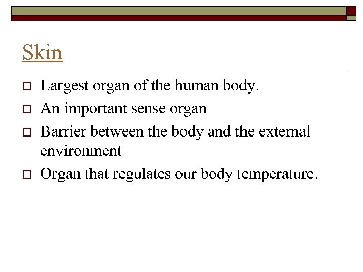 Skin o o Largest organ of the human body. An important sense organ Barrier between the body and the external environment Organ that regulates our body temperature.