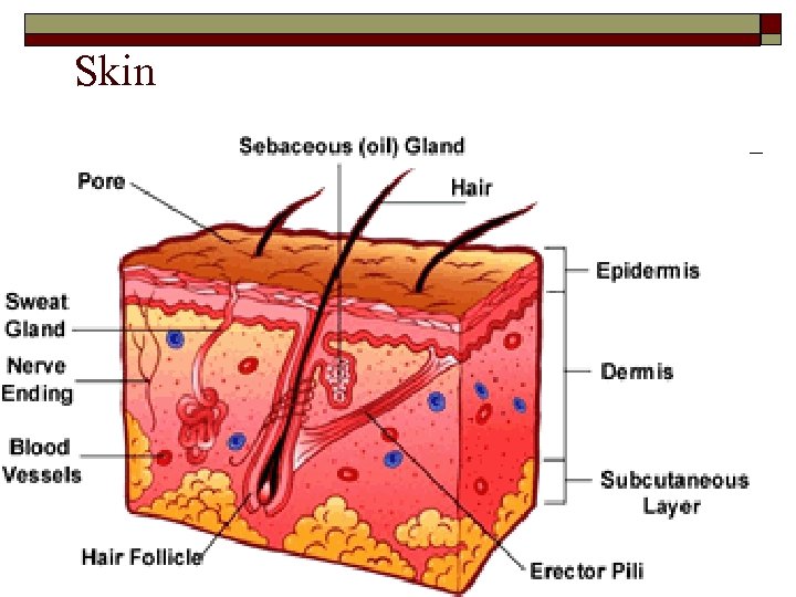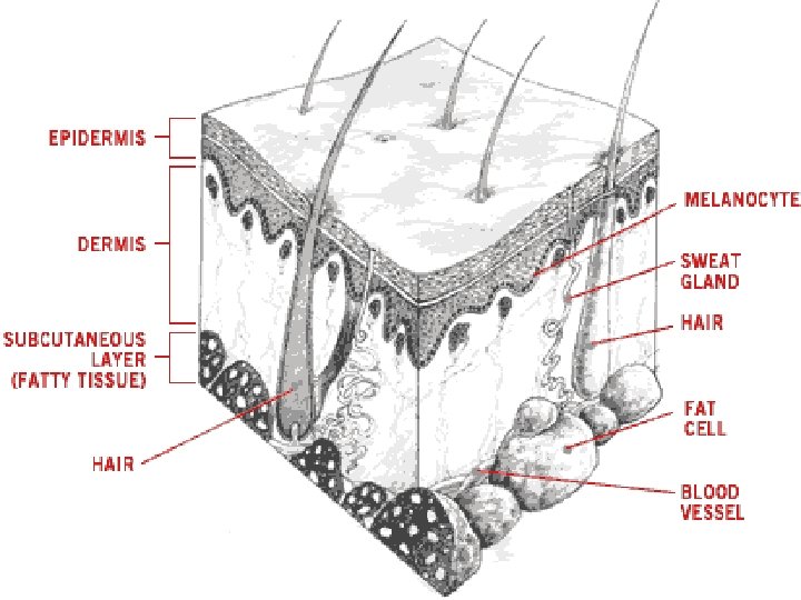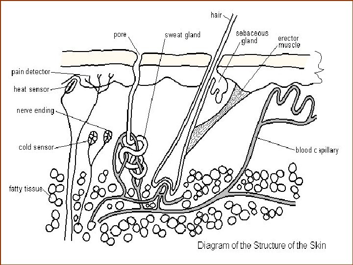Learning Objectives o o o 12. 2 Structure and function of the skin (c) Identify on a diagram of the skin: hairs, sweat glands, temperature receptors, blood vessels and fatty tissue (d) Describe the maintenance of a constant body temperature in humans in terms of insulation and the role of: temperature receptors in the skin, sweating, shivering, blood vessels near the skin surface and the co-ordinating role of the brain