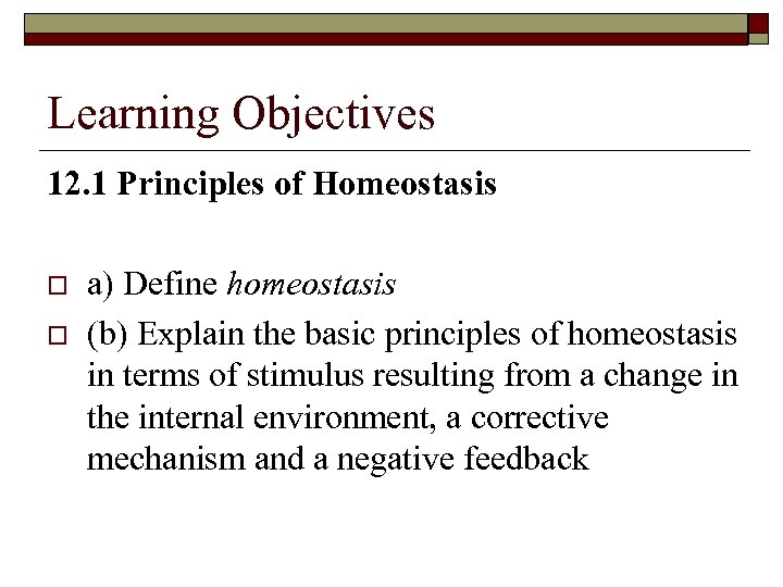 Learning Objectives 12. 1 Principles of Homeostasis o o a) Define homeostasis (b) Explain the basic principles of homeostasis in terms of stimulus resulting from a change in the internal environment, a corrective mechanism and a negative feedback