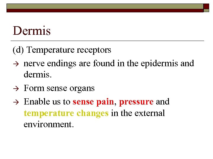 Dermis (d) Temperature receptors nerve endings are found in the epidermis and dermis. Form sense organs Enable us to sense pain, pressure and temperature changes in the external environment.