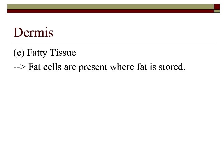 Dermis (e) Fatty Tissue --> Fat cells are present where fat is stored.
