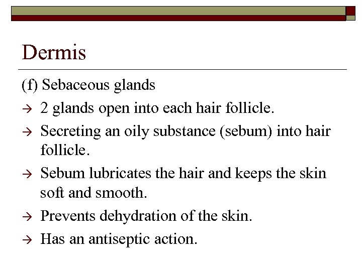 Dermis (f) Sebaceous glands 2 glands open into each hair follicle. Secreting an oily substance (sebum) into hair follicle. Sebum lubricates the hair and keeps the skin soft and smooth. Prevents dehydration of the skin. Has an antiseptic action.