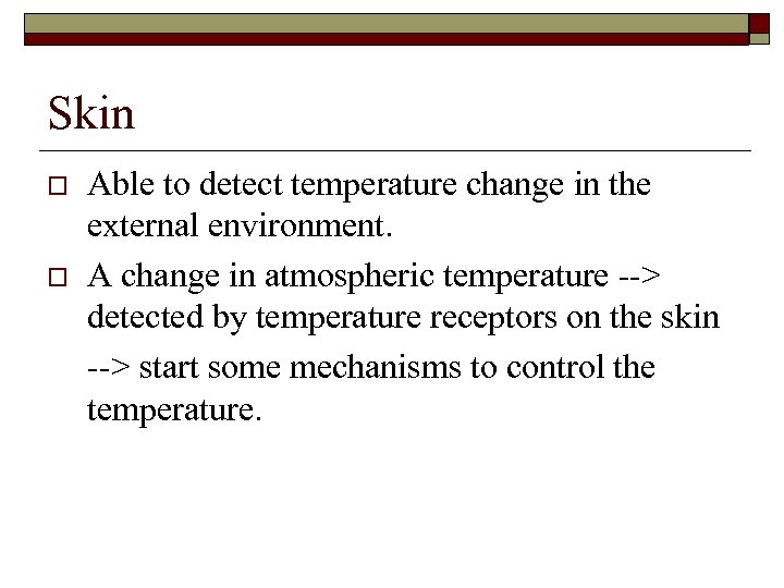 Skin o o Able to detect temperature change in the external environment. A change in atmospheric temperature --> detected by temperature receptors on the skin --> start some mechanisms to control the temperature.