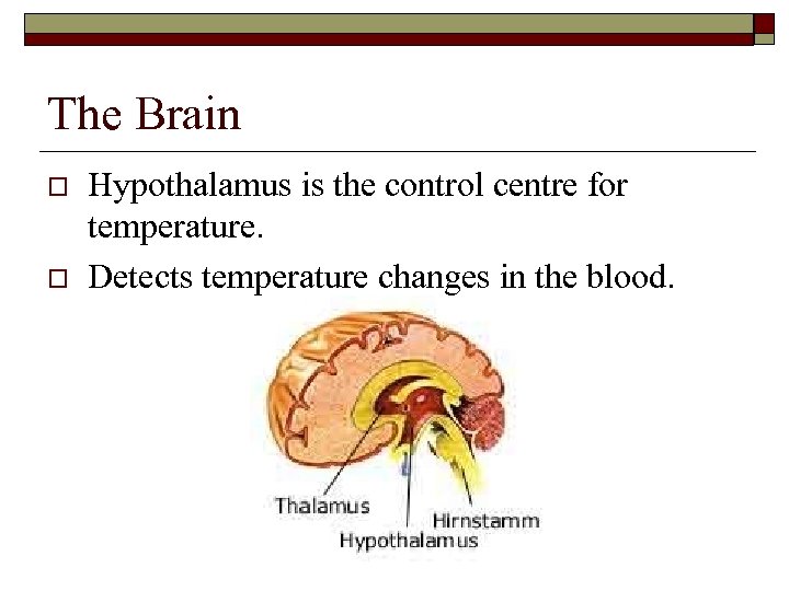 The Brain o o Hypothalamus is the control centre for temperature. Detects temperature changes in the blood.