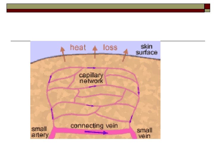 Rise in Blood Temperature Detected by hypothalamus Heat released During exercise Heat loss Body Temp 37 C Cold environment Drop in blood temperature Increased sweating Vasodilation Blood temp rises Detected by hypothalamus Decreased sweating Vasoconstriction shivering