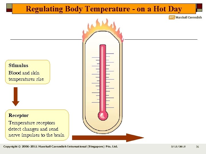 Regulating Body Temperature - on a Hot Day Stimulus Blood and skin temperatures rise Copyright © 2006 -2011 Marshall Cavendish International (Singapore) Pte. Ltd. 3/15/2018 35