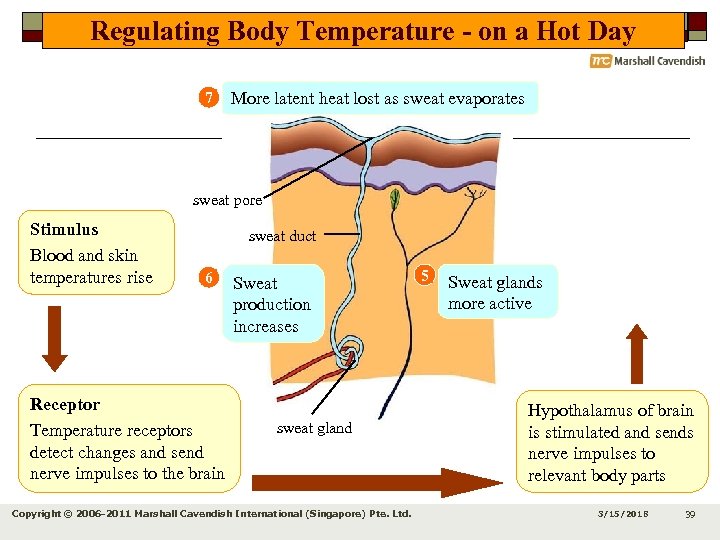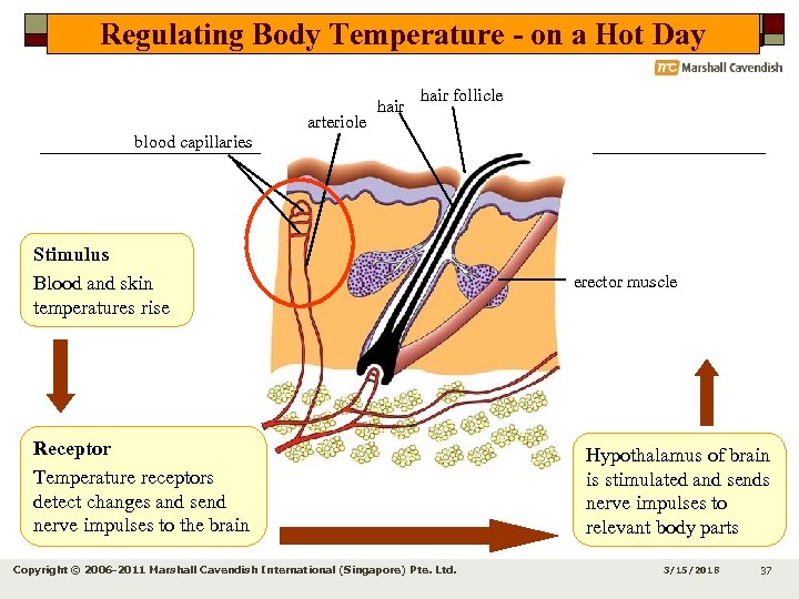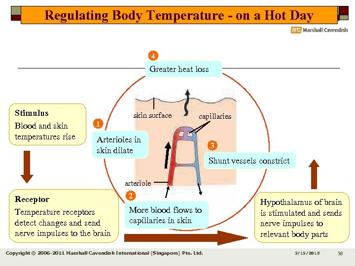 Regulating Body Temperature - on a Hot Day Stimulus Blood and skin temperatures rise Receptor Temperature receptors detect changes and send nerve impulses to the brain Copyright © 2006 -2011 Marshall Cavendish International (Singapore) Pte. Ltd. 3/15/2018 36