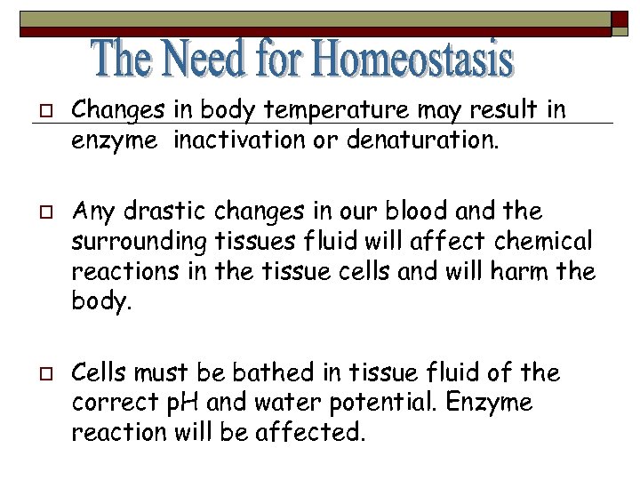 o o o Changes in body temperature may result in enzyme inactivation or denaturation. Any drastic changes in our blood and the surrounding tissues fluid will affect chemical reactions in the tissue cells and will harm the body. Cells must be bathed in tissue fluid of the correct p. H and water potential. Enzyme reaction will be affected.