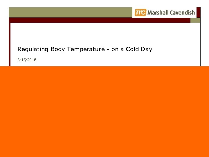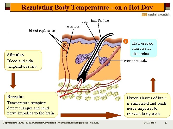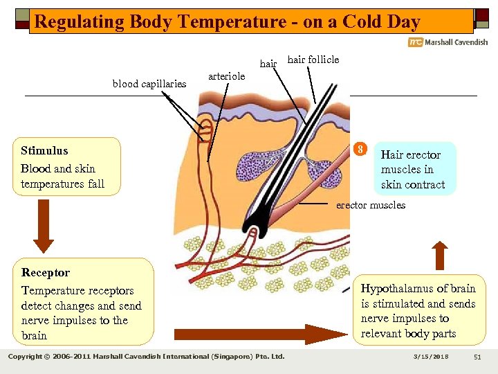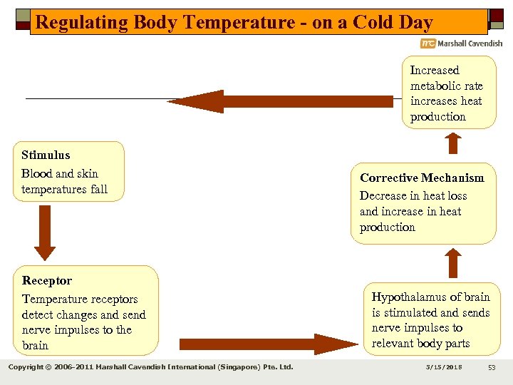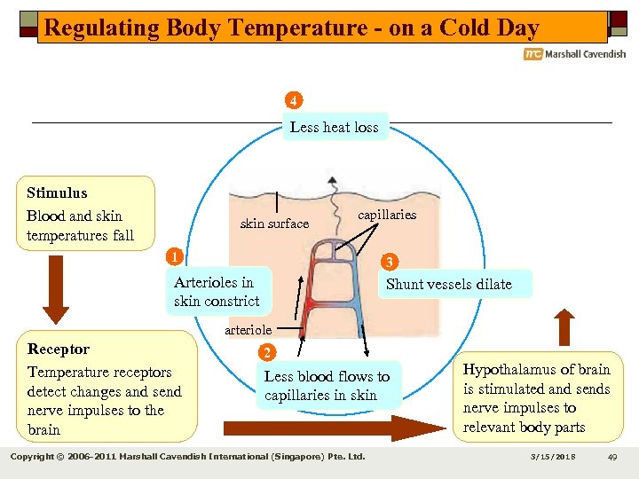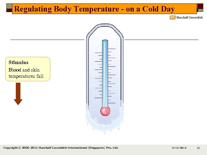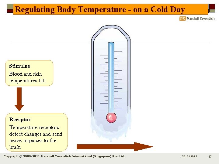 Regulating Body Temperature - on a Cold Day Stimulus Blood and skin temperatures fall Copyright © 2006 -2011 Marshall Cavendish International (Singapore) Pte. Ltd. 3/15/2018 46