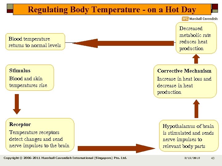 Regulating Body Temperature - on a Hot Day Decreased metabolic rate reduces heat production Stimulus Blood and skin temperatures rise Receptor Temperature receptors detect changes and send nerve impulses to the brain Copyright © 2006 -2011 Marshall Cavendish International (Singapore) Pte. Ltd. Corrective Mechanism Increase in heat loss and decrease in heat production Hypothalamus of brain is stimulated and sends nerve impulses to relevant body parts 3/15/2018 42
