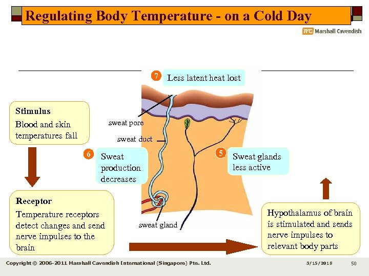 Regulating Body Temperature - on a Cold Day 4 Less heat loss Stimulus Blood and skin temperatures fall skin surface capillaries 1 3 Arterioles in skin constrict Shunt vessels dilate arteriole Receptor Temperature receptors detect changes and send nerve impulses to the brain 2 Less blood flows to capillaries in skin Copyright © 2006 -2011 Marshall Cavendish International (Singapore) Pte. Ltd. Hypothalamus of brain is stimulated and sends nerve impulses to relevant body parts 3/15/2018 49