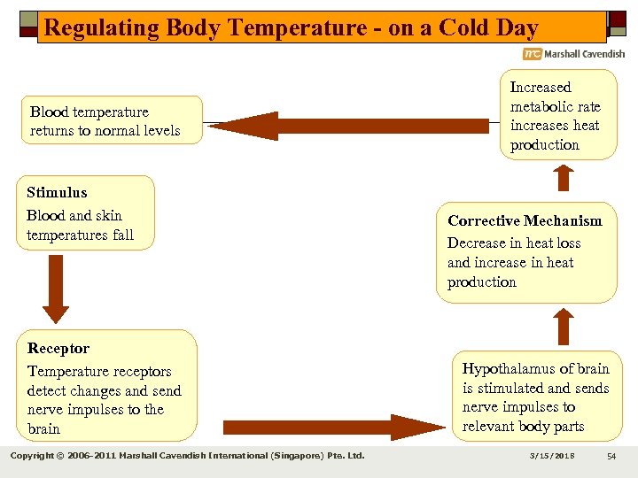 Regulating Body Temperature - on a Cold Day Increased metabolic rate increases heat production Stimulus Blood and skin temperatures fall Receptor Temperature receptors detect changes and send nerve impulses to the brain Copyright © 2006 -2011 Marshall Cavendish International (Singapore) Pte. Ltd. Corrective Mechanism Decrease in heat loss and increase in heat production Hypothalamus of brain is stimulated and sends nerve impulses to relevant body parts 3/15/2018 53