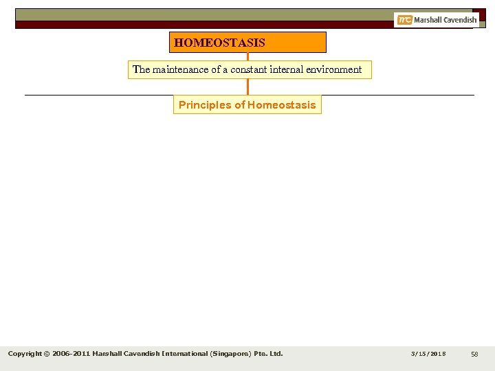 HOMEOSTASIS The maintenance of a constant internal environment Principles of Homeostasis Stimulus Change in internal environment Copyright © 2006 -2011 Marshall Cavendish International (Singapore) Pte. Ltd. 3/15/2018 59