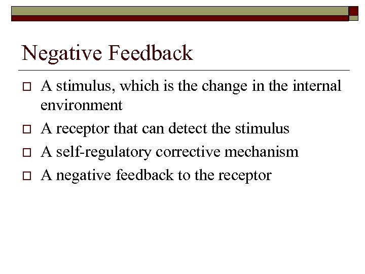 Negative Feedback o o A stimulus, which is the change in the internal environment A receptor that can detect the stimulus A self-regulatory corrective mechanism A negative feedback to the receptor