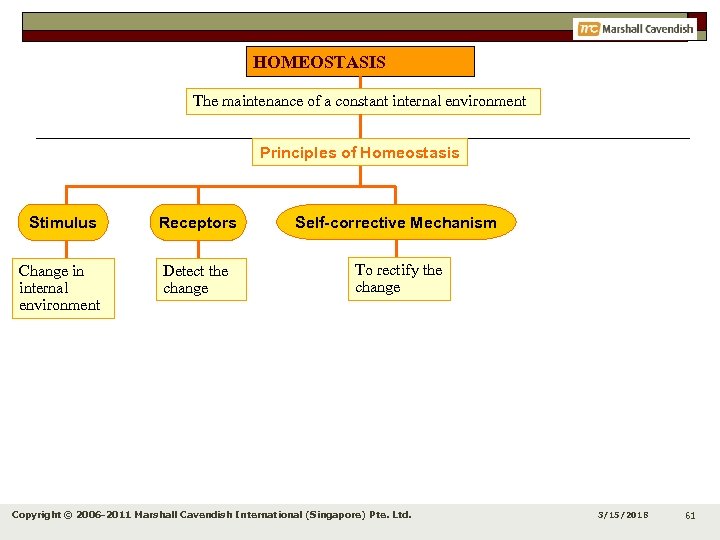 HOMEOSTASIS The maintenance of a constant internal environment Principles of Homeostasis Stimulus Receptors Change in internal environment Detect the change Copyright © 2006 -2011 Marshall Cavendish International (Singapore) Pte. Ltd. 3/15/2018 60