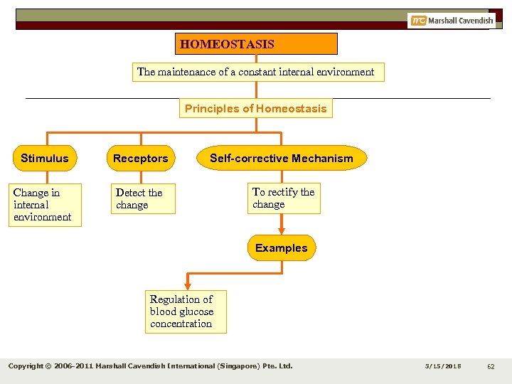 HOMEOSTASIS The maintenance of a constant internal environment Principles of Homeostasis Stimulus Receptors Self-corrective Mechanism Change in internal environment Detect the change To rectify the change Copyright © 2006 -2011 Marshall Cavendish International (Singapore) Pte. Ltd. 3/15/2018 61