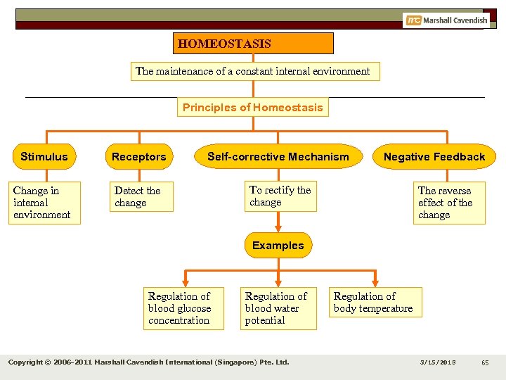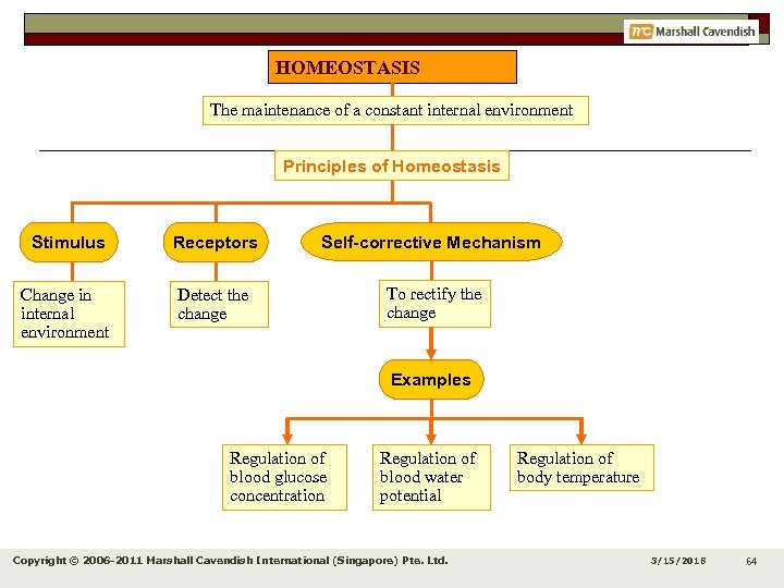 HOMEOSTASIS The maintenance of a constant internal environment Principles of Homeostasis Stimulus Receptors Self-corrective Mechanism Change in internal environment Detect the change To rectify the change Examples Regulation of blood glucose concentration Regulation of blood water potential Copyright © 2006 -2011 Marshall Cavendish International (Singapore) Pte. Ltd. 3/15/2018 63