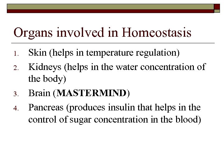 Organs involved in Homeostasis 1. 2. 3. 4. Skin (helps in temperature regulation) Kidneys (helps in the water concentration of the body) Brain (MASTERMIND) Pancreas (produces insulin that helps in the control of sugar concentration in the blood)