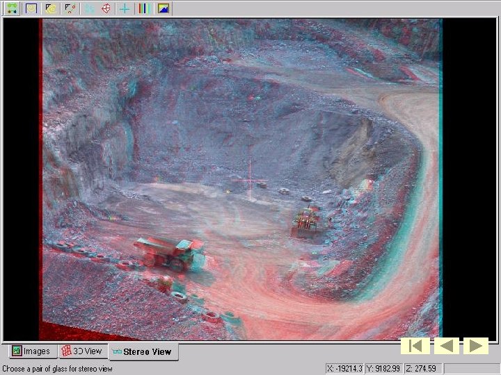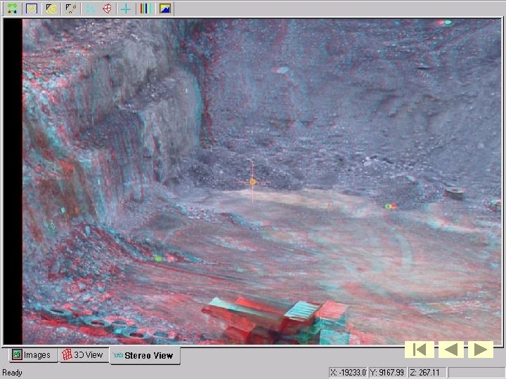 3 DM Analyst 3 D View of Model with Control Points Displayed Viewing objects in 3 D makes extracting 3 D data easy and accurate. We have implemented support for the Stereographics Crystal Eyes or the Z Screen polarising glasses for stereo viewing. The operator can view the object in 3 D, overlay the DTM points and triangles in 3 D, and even drive a floating mark around in 3 D using the mouse, adding and deleting points at will. The Control Point positions in the following model are displayed as X, Y and Z values in the bottom right of the Stereo Display window. Note: The following images have been presented as an Anaglyph for this presentation. In a working situation the Stereographics stereo viewing system is recommended. To view the model in 3 D you will need to use a pair of Anaglyph glasses (red filter - left eye, blue filter - right eye).