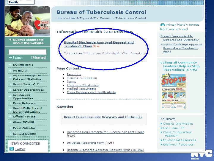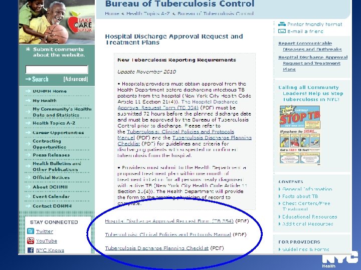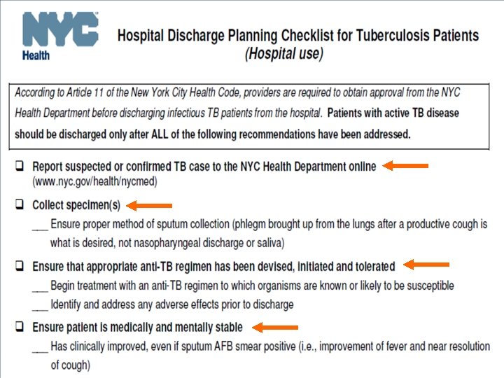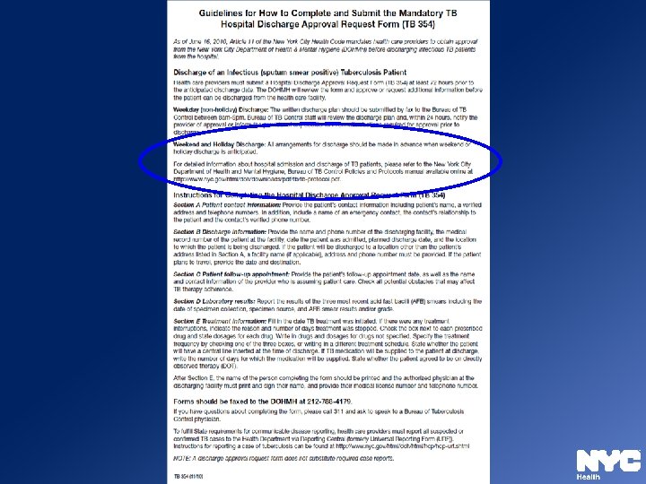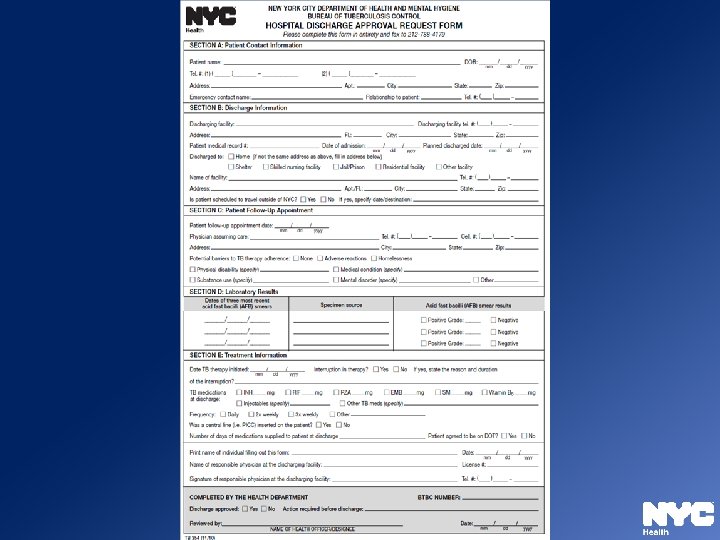 Hospital Discharge Form Ø Hospital Discharge Approval Request Form (TB 354) and Instructions Ø Hospital Discharge Planning Checklist for Tuberculosis Patients Ø Available on NYC Health Department’s website: www. nyc. gov/health/tb