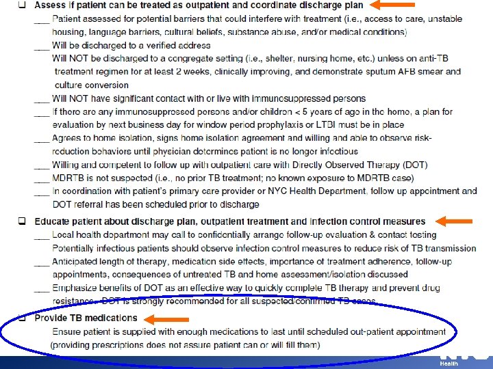 Criteria for Discharge • Clinical improvement • Tolerating anti-TB meds • Patient must be reported to DOH (212 -788 -4162 or 347 -3967400), but must be reported via URF as well • Electronic URF filled out within 24 hrs. • Patient should have sputa for AFB • CXR should be done • Involvement of DOHMH in discharge planning with submission of discharge plan to DOHMH – Referral to DOH clinic and DOT Instructions given to patient and household members if they were exposed to an infectious patient