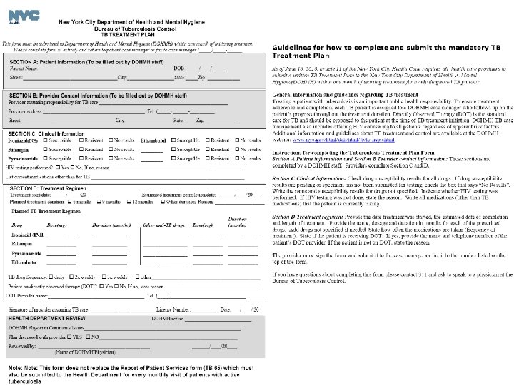 TB Treatment Plan Form Ø NYC Health Department case manager will provide the treatment plan form to treating physician for completion Ø Treatment plan form does not replace Report of Patient Services Form (TB 65)