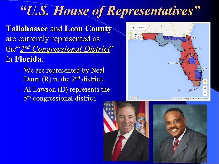 “U. S. House of Representatives” Tallahassee and Leon County are currently represented as the“ 2 nd Congressional District” in Florida. – We are represented by Neal Dunn (R) in the 2 nd district. – Al Lawson (D) represents the 5 th congressional district.