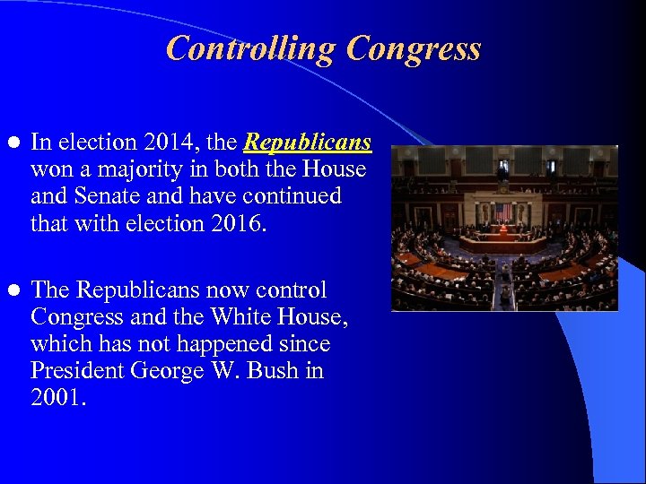 Controlling Congress l In election 2014, the Republicans won a majority in both the House and Senate and have continued that with election 2016. l The Republicans now control Congress and the White House, which has not happened since President George W. Bush in 2001.