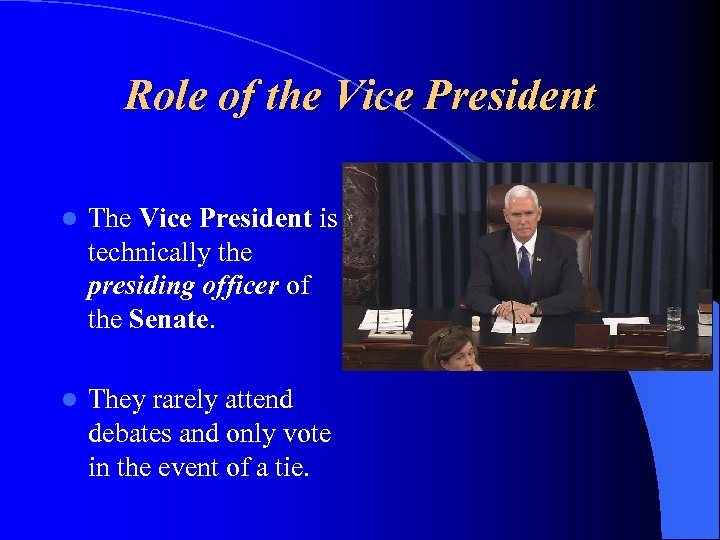 Role of the Vice President l The Vice President is technically the presiding officer of the Senate. l They rarely attend debates and only vote in the event of a tie.