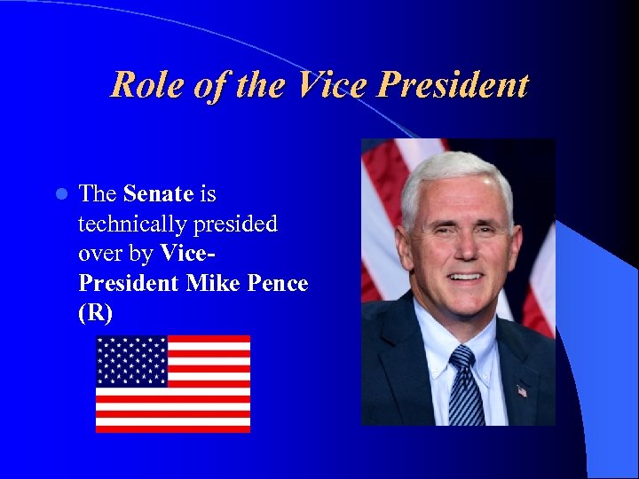 Role of the Vice President l The Senate is technically presided over by Vice. President Mike Pence (R)