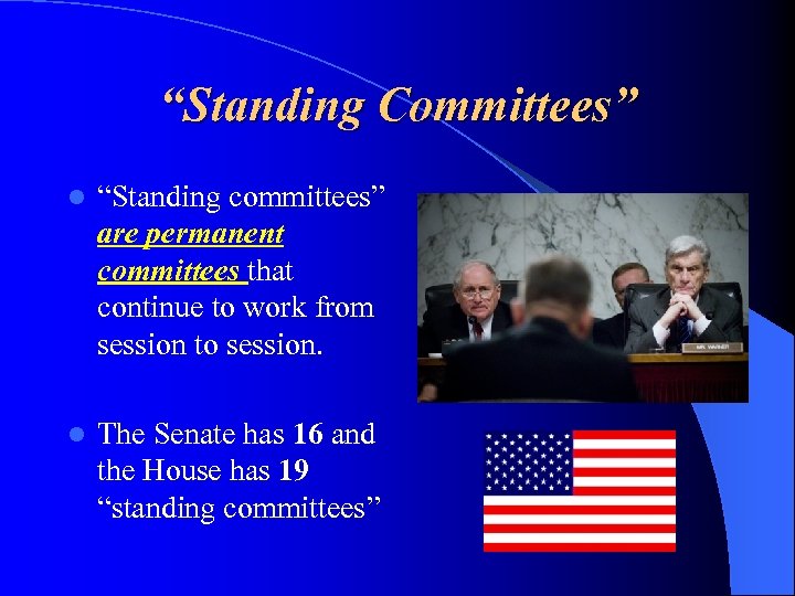 “Standing Committees” l “Standing committees” are permanent committees that continue to work from session to session. l The Senate has 16 and the House has 19 “standing committees”
