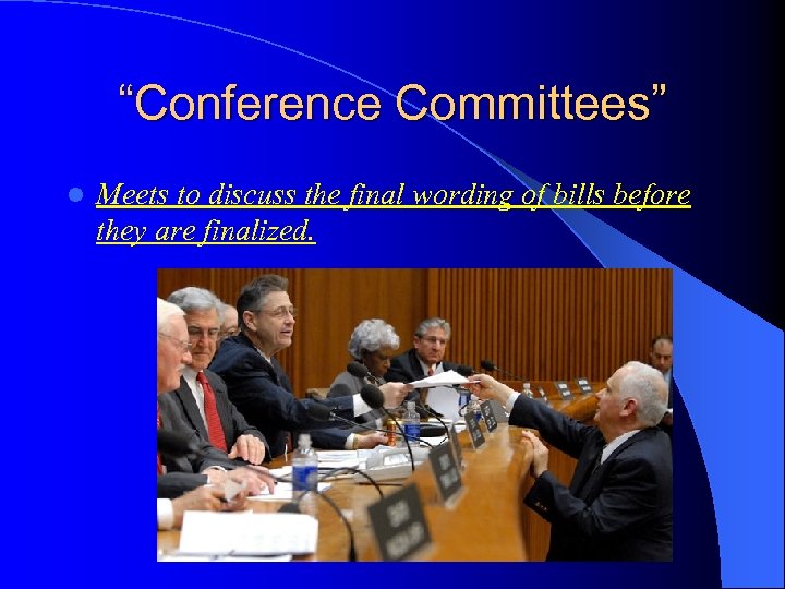 “Conference Committees” l Meets to discuss the final wording of bills before they are finalized.