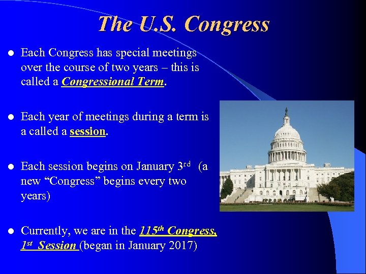 The U. S. Congress l Each Congress has special meetings over the course of two years – this is called a Congressional Term. l Each year of meetings during a term is a called a session. l Each session begins on January 3 rd (a new “Congress” begins every two years) l Currently, we are in the 115 th Congress, 1 st Session (began in January 2017)