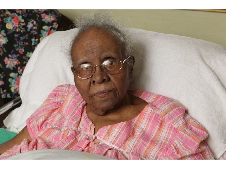 Case – Ms. Alma • 2007 - 96 yo woman, in wheelchair, with breast/axillary mass, left arm blood clot • No doctor in 10 years • Uncontrolled HTN, DM, Severe Arthritis • Dx: Regionally metastatic Breast CA • Rx: Femara, Coumadin, BP meds, PT