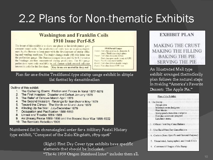 2. 2 Plans for Non-thematic Exhibits Plan for one-frame Traditional type stamp usage exhibit in simple list format by denomination An Illustrated Mail type exhibit arranged thematically plan follows the natural steps in making “America’s Favorite Dessert: The Apple Pie. ” Numbered list in chronological order for a military Postal History type exhibit, “Conquest of the Zulu Kingdom, 1879 -1906” (Right) First Day Cover type exhibits have specific elements that should be included. “The 4 c 1959 Oregon Statehood Issue” includes them all. 10