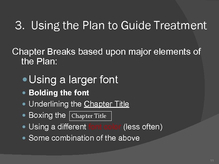 3. Using the Plan to Guide Treatment Chapter Breaks based upon major elements of the Plan: Using a larger font Bolding the font Underlining the Chapter Title Boxing the Chapter Title Using a different font color (less often) Some combination of the above 11