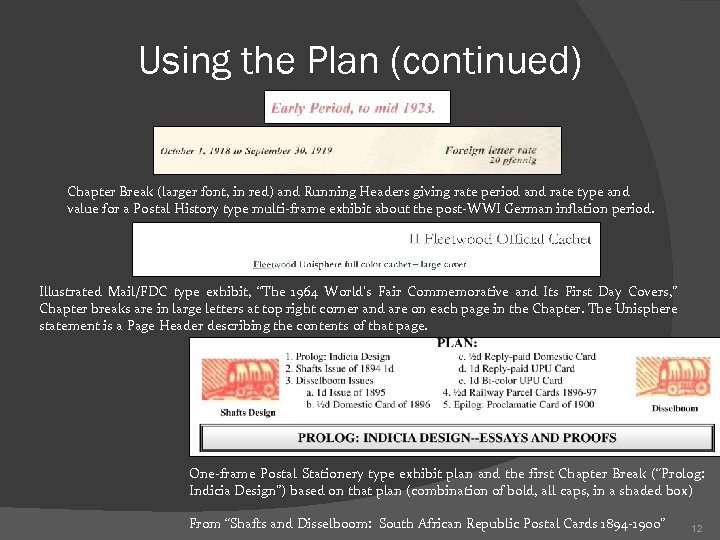 Using the Plan (continued) Chapter Break (larger font, in red) and Running Headers giving rate period and rate type and value for a Postal History type multi-frame exhibit about the post-WWI German inflation period. Illustrated Mail/FDC type exhibit, “The 1964 World’s Fair Commemorative and Its First Day Covers, ” Chapter breaks are in large letters at top right corner and are on each page in the Chapter. The Unisphere statement is a Page Header describing the contents of that page. One-frame Postal Stationery type exhibit plan and the first Chapter Break (“Prolog: Indicia Design”) based on that plan (combination of bold, all caps, in a shaded box) From “Shafts and Disselboom: South African Republic Postal Cards 1894 -1900” 12