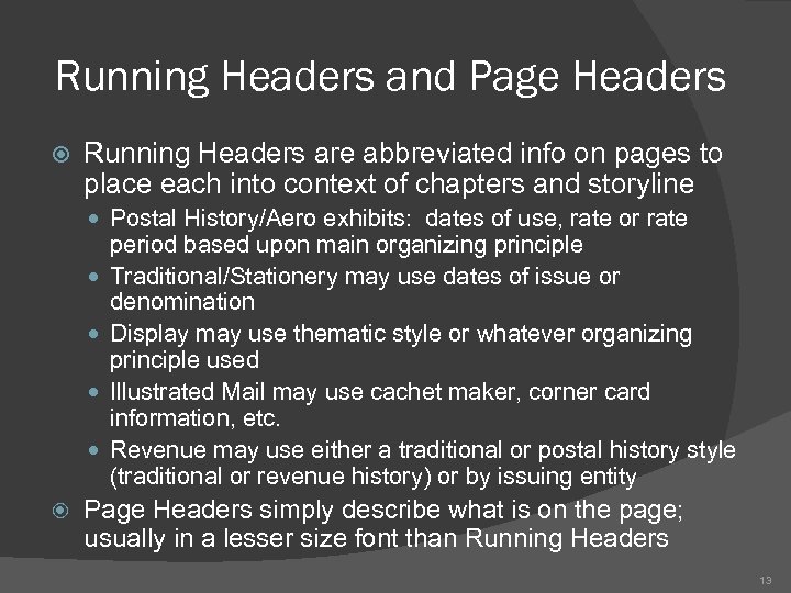 Running Headers and Page Headers Running Headers are abbreviated info on pages to place each into context of chapters and storyline Postal History/Aero exhibits: dates of use, rate or rate period based upon main organizing principle Traditional/Stationery may use dates of issue or denomination Display may use thematic style or whatever organizing principle used Illustrated Mail may use cachet maker, corner card information, etc. Revenue may use either a traditional or postal history style (traditional or revenue history) or by issuing entity Page Headers simply describe what is on the page; usually in a lesser size font than Running Headers 13