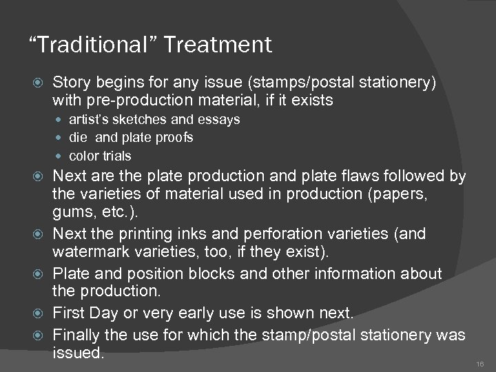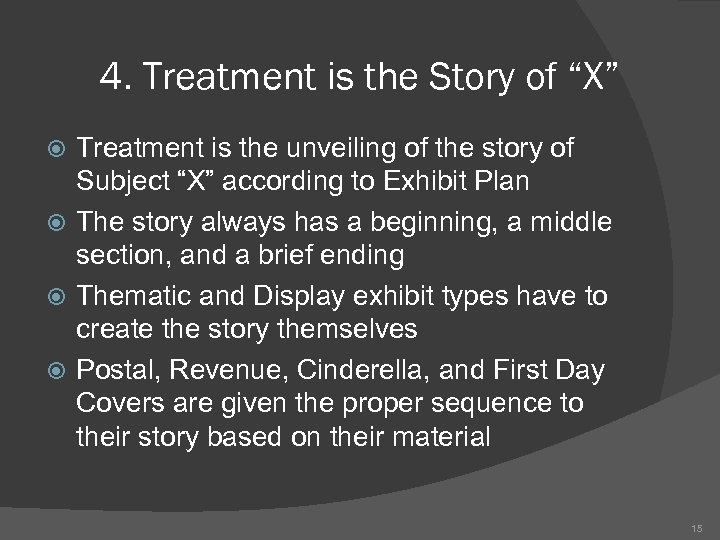 4. Treatment is the Story of “X” Treatment is the unveiling of the story of Subject “X” according to Exhibit Plan The story always has a beginning, a middle section, and a brief ending Thematic and Display exhibit types have to create the story themselves Postal, Revenue, Cinderella, and First Day Covers are given the proper sequence to their story based on their material 15