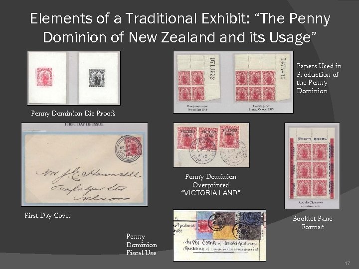 Elements of a Traditional Exhibit: “The Penny Dominion of New Zealand its Usage” Papers Used in Production of the Penny Dominion Die Proofs Penny Dominion Overprinted “VICTORIA LAND” First Day Cover Booklet Pane Format Penny Dominion Fiscal Use 17
