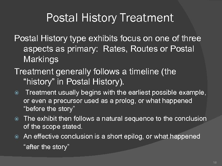 Postal History Treatment Postal History type exhibits focus on one of three aspects as primary: Rates, Routes or Postal Markings Treatment generally follows a timeline (the “history” in Postal History). Treatment usually begins with the earliest possible example, or even a precursor used as a prolog, or what happened “before the story” The exhibit then follows a natural sequence to the conclusion of the scope stated. An effective conclusion is a short epilog, or what happened “after the story” 18