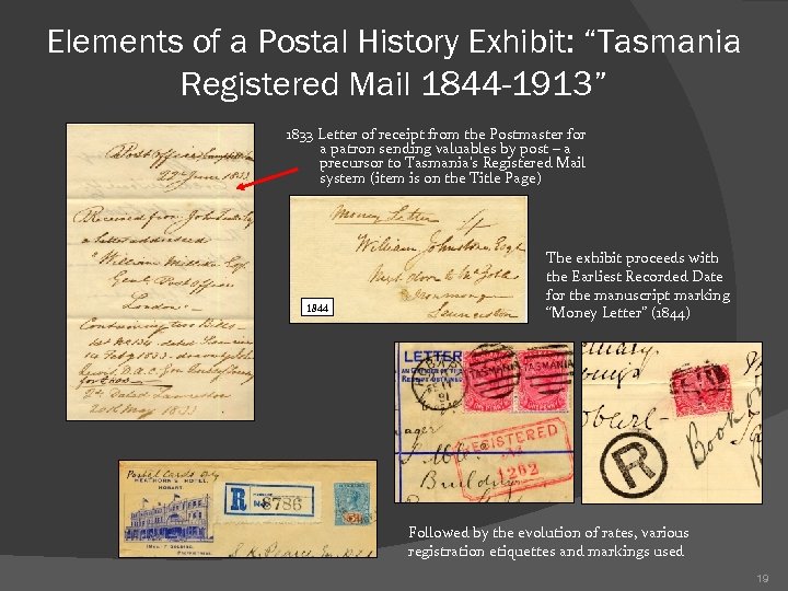 Elements of a Postal History Exhibit: “Tasmania Registered Mail 1844 -1913” 1833 Letter of receipt from the Postmaster for a patron sending valuables by post – a precursor to Tasmania’s Registered Mail system (item is on the Title Page) 1844 The exhibit proceeds with the Earliest Recorded Date for the manuscript marking “Money Letter” (1844) Followed by the evolution of rates, various registration etiquettes and markings used 19