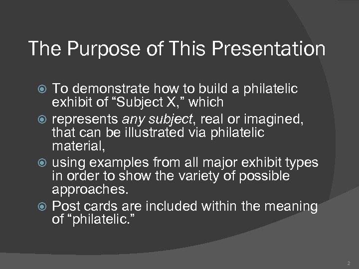 The Purpose of This Presentation To demonstrate how to build a philatelic exhibit of “Subject X, ” which represents any subject, real or imagined, that can be illustrated via philatelic material, using examples from all major exhibit types in order to show the variety of possible approaches. Post cards are included within the meaning of “philatelic. ” 2