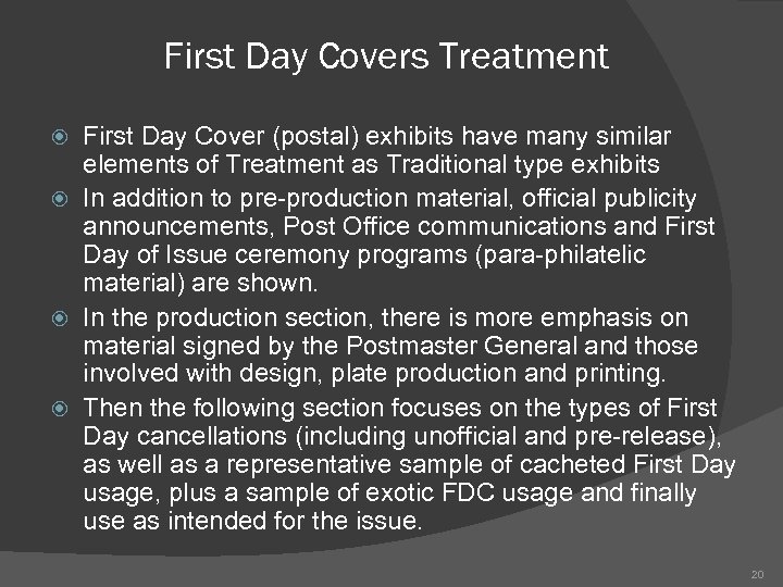 First Day Covers Treatment First Day Cover (postal) exhibits have many similar elements of Treatment as Traditional type exhibits In addition to pre-production material, official publicity announcements, Post Office communications and First Day of Issue ceremony programs (para-philatelic material) are shown. In the production section, there is more emphasis on material signed by the Postmaster General and those involved with design, plate production and printing. Then the following section focuses on the types of First Day cancellations (including unofficial and pre-release), as well as a representative sample of cacheted First Day usage, plus a sample of exotic FDC usage and finally use as intended for the issue. 20