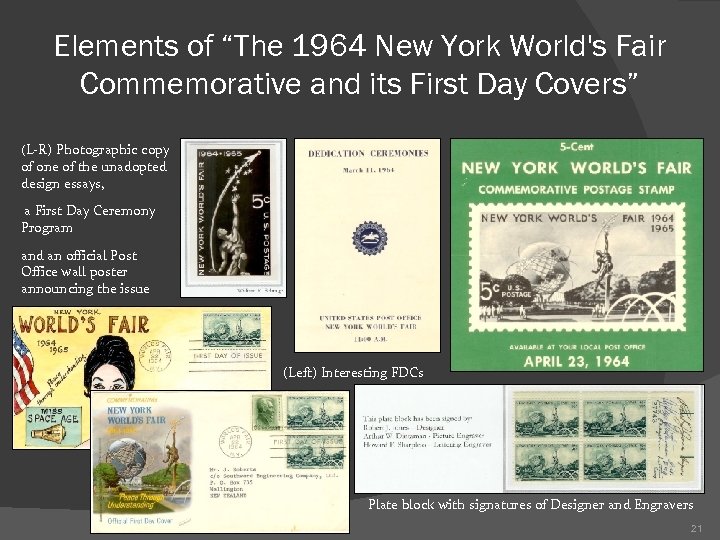 Elements of “The 1964 New York World's Fair Commemorative and its First Day Covers” (L-R) Photographic copy of one of the unadopted design essays, a First Day Ceremony Program and an official Post Office wall poster announcing the issue (Left) Interesting FDCs Plate block with signatures of Designer and Engravers 21