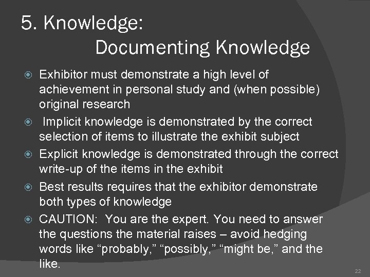 5. Knowledge: Documenting Knowledge Exhibitor must demonstrate a high level of achievement in personal study and (when possible) original research Implicit knowledge is demonstrated by the correct selection of items to illustrate the exhibit subject Explicit knowledge is demonstrated through the correct write-up of the items in the exhibit Best results requires that the exhibitor demonstrate both types of knowledge CAUTION: You are the expert. You need to answer the questions the material raises – avoid hedging words like “probably, ” “possibly, ” “might be, ” and the like. 22