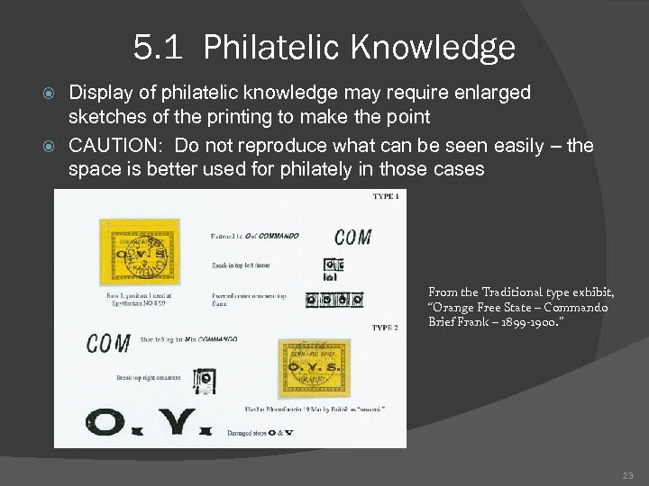 5. 1 Philatelic Knowledge Display of philatelic knowledge may require enlarged sketches of the printing to make the point CAUTION: Do not reproduce what can be seen easily – the space is better used for philately in those cases From the Traditional type exhibit, “Orange Free State – Commando Brief Frank – 1899 -1900. ” 23