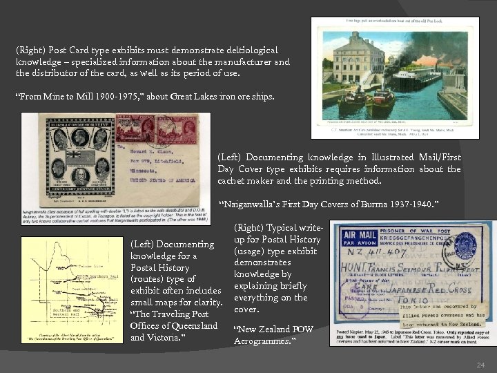 (Right) Post Card type exhibits must demonstrate deltiological knowledge – specialized information about the manufacturer and the distributor of the card, as well as its period of use. “From Mine to Mill 1900 -1975, ” about Great Lakes iron ore ships. (Left) Documenting knowledge in Illustrated Mail/First Day Cover type exhibits requires information about the cachet maker and the printing method. “Naiganwalla’s First Day Covers of Burma 1937 -1940. ” (Left) Documenting knowledge for a Postal History (routes) type of exhibit often includes small maps for clarity. “The Traveling Post Offices of Queensland Victoria. ” (Right) Typical writeup for Postal History (usage) type exhibit demonstrates knowledge by explaining briefly everything on the cover. “New Zealand POW Aerogrammes. ” 24