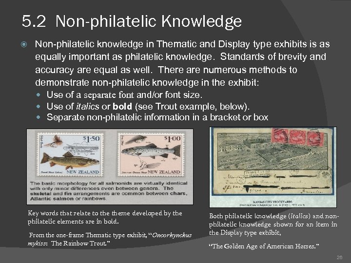 5. 2 Non-philatelic Knowledge Non-philatelic knowledge in Thematic and Display type exhibits is as equally important as philatelic knowledge. Standards of brevity and accuracy are equal as well. There are numerous methods to demonstrate non-philatelic knowledge in the exhibit: Use of a separate font and/or font size. Use of italics or bold (see Trout example, below). Separate non-philatelic information in a bracket or box Key words that relate to theme developed by the philatelic elements are in bold. From the one-frame Thematic type exhibit, “Oncorhynchus mykiss: The Rainbow Trout. ” Both philatelic knowledge (italics) and nonphilatelic knowledge shown for an item in the Display type exhibit, “The Golden Age of American Horses. ” 26